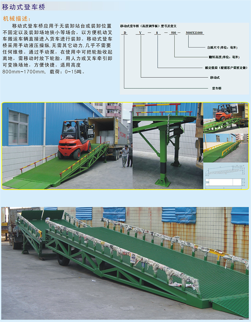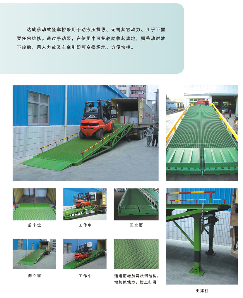 移动登车桥应用于无装卸站台或装卸位置不固定以及装卸场地狭小等场合,以方便机动叉车搬运车辆直接进入货车进行装卸,大大提高工作效率,采用手动液压操纵、无需其它动力;通过手动泵,在使用中可把轮胎收起离地,需移动时放下轮胎,用人力或叉车牵引即可变换场地,方便快捷、几乎不需要任何维修。